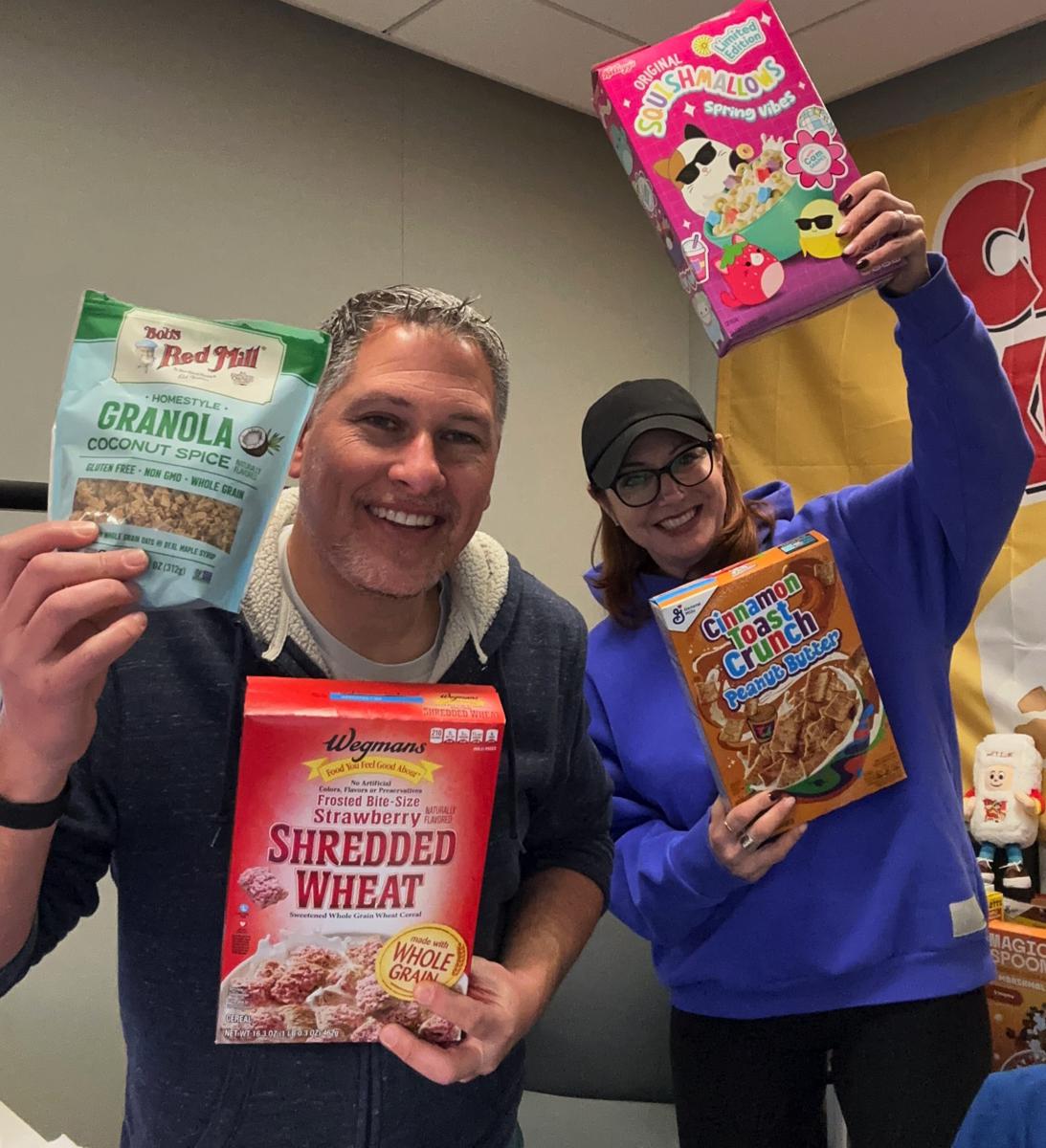 Andy is out sucking blood, so we thank Danielle for sitting in today! We're going to try TWO new cereals today, at her request. First, Cinnamon Toast Crunch Peanut Butter. Then we'll try a dud from Bob, some Wegman's shredded wheat, and the bonus box is... the new Squishmallows Spring Vibes!